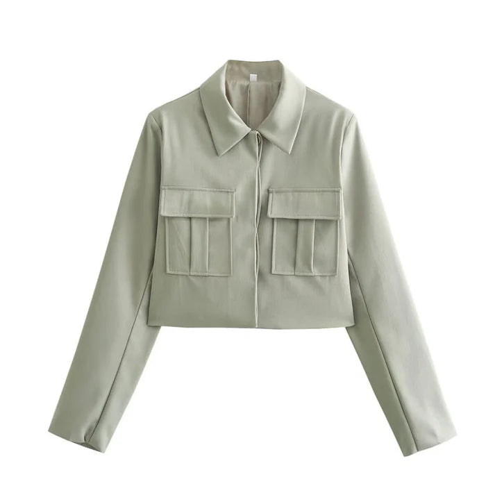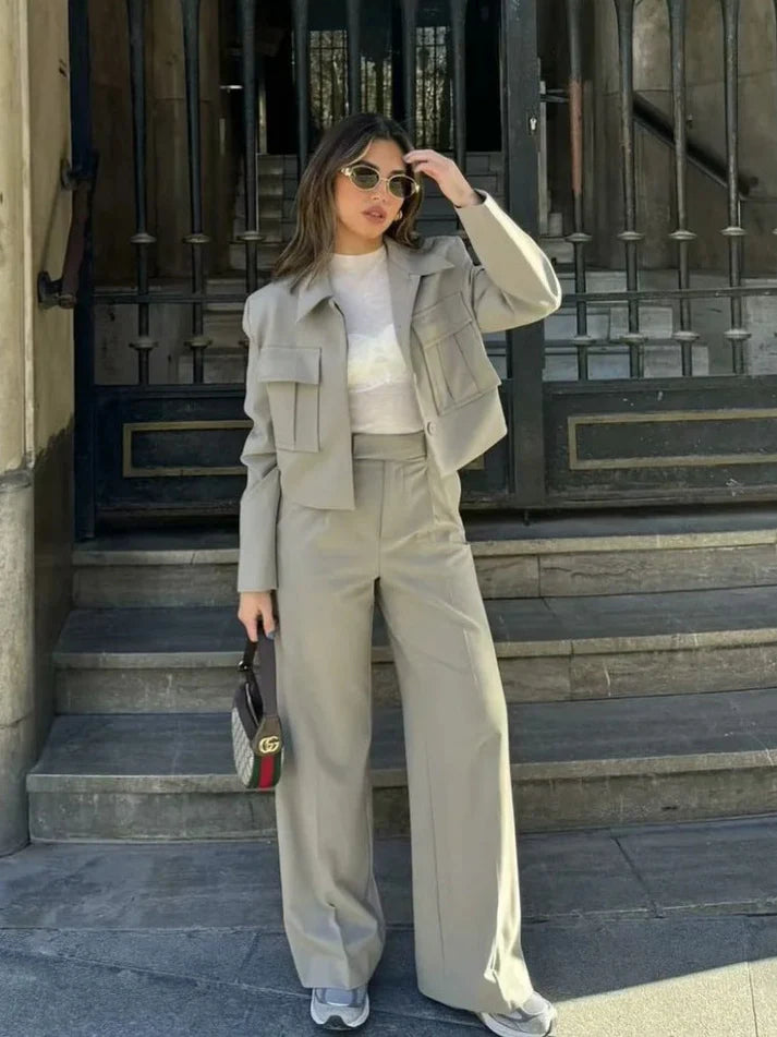 - Setets innehåll: En elegant jacka med bröstfickor och raka byxor med hög midja.